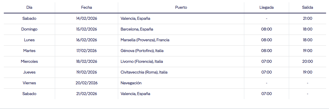 MSC ORCHESTRA 7 NOCHES INFORMACIÓN SALIDA DESDE VALENCIA FEBRERO TARIFA BÁSICA 383€ Precio por persona en habitación doble SOLICITAR RESERVA Nombre Email Teléfono (WhatsApp) Número de adultos Número de niños ¿Dónde quieres viajar? He leído y acepto la Política de Privacidad